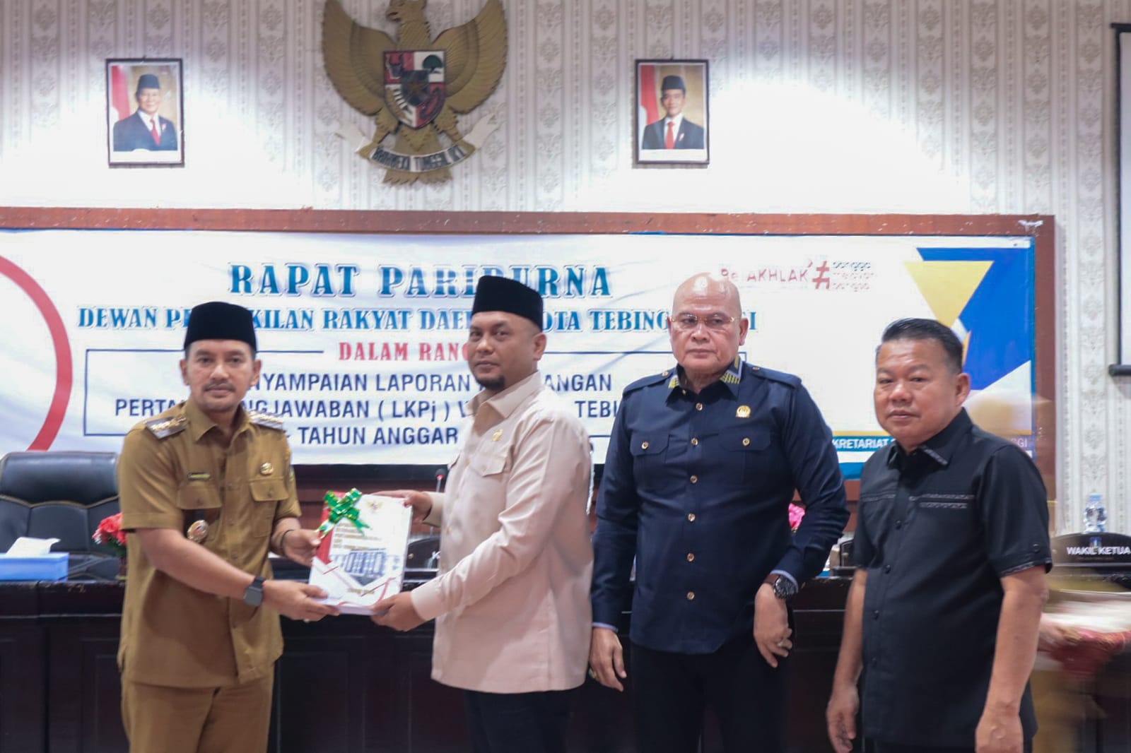 Walikota Tebingtinggi H. Iman Irdian Saragih, menyampaikan Laporan Keterangan Pertanggungjawaban (LKPJ) Tahun Anggaran 2025, dalam Rapat Paripurna DPRD Kota Tebingtinggi, berlangsung di ruang Rapat Paripurna Gedung DPRD, Jalan Dr. Sutomo, Selasa (7/4/2026).