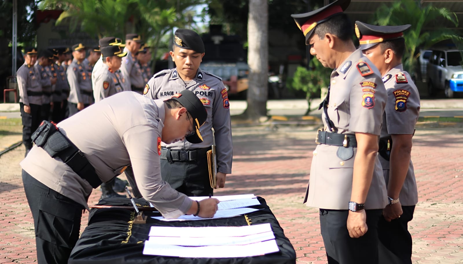 Adapun pejabat yang melaksanakan serah terima jabatan, antara lain PS Kabag Ren Polres Langkat dari Kompol Mardianto kepada AKP Harianto, yang sebelumnya menjabat Kasubbag Bekpal Baglog Polres Langkat.